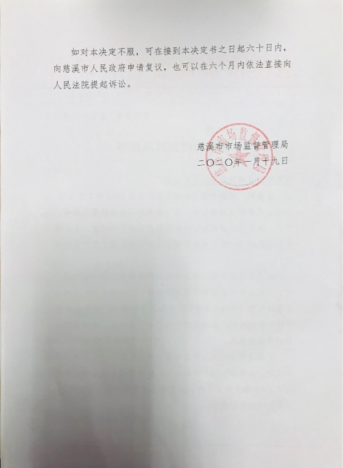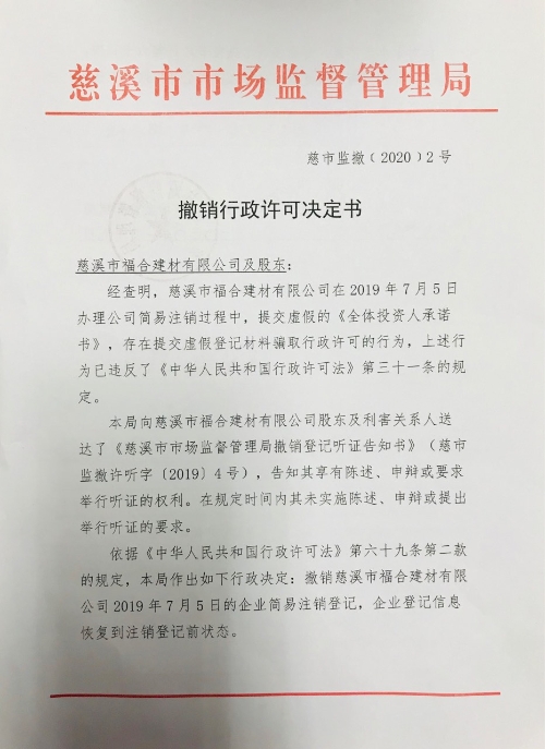 《撤销行政许可决定书》(慈市监撤【2020】2号)详见下图。