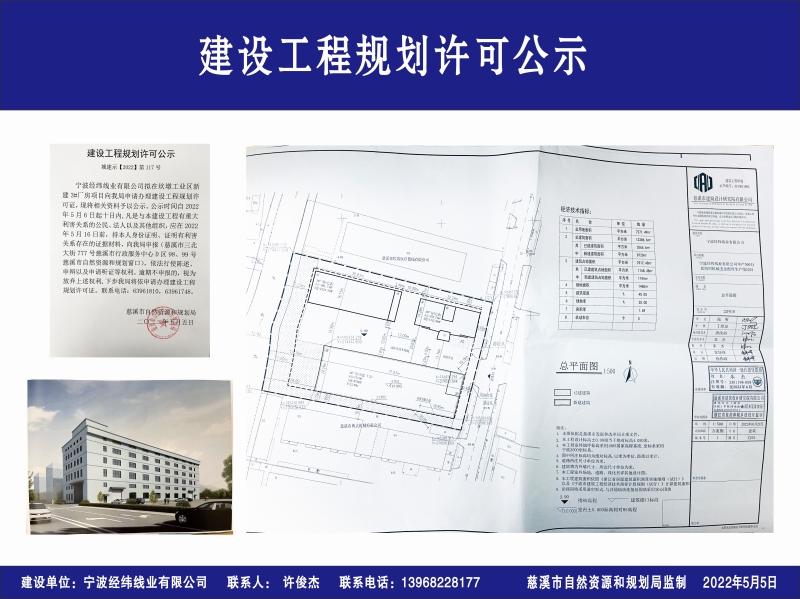 宁波经纬线业有限公司拟在坎墩工业区新建3#厂房项目向我局申请办理建设工程规划许可证,现将相关资料予以公示。公示时间自2022年5月6日起十日内,凡是与本建设工程有重大利害关系的公民、法人以及其他组织,应在2022年5月16日前,持本人身份证明、证明有利害关系存在的证据材料,向我局申报(慈溪市三北大街777号慈溪市行政服务中心D区98、99号慈溪市自然资源和规划窗口),依法行使陈述、申辩以及申请听证等权利。逾期不申报的,视为放弃上述权利,下步我局将依申请办理建设工程规划许可证。联系电话:63961810,63961748。
